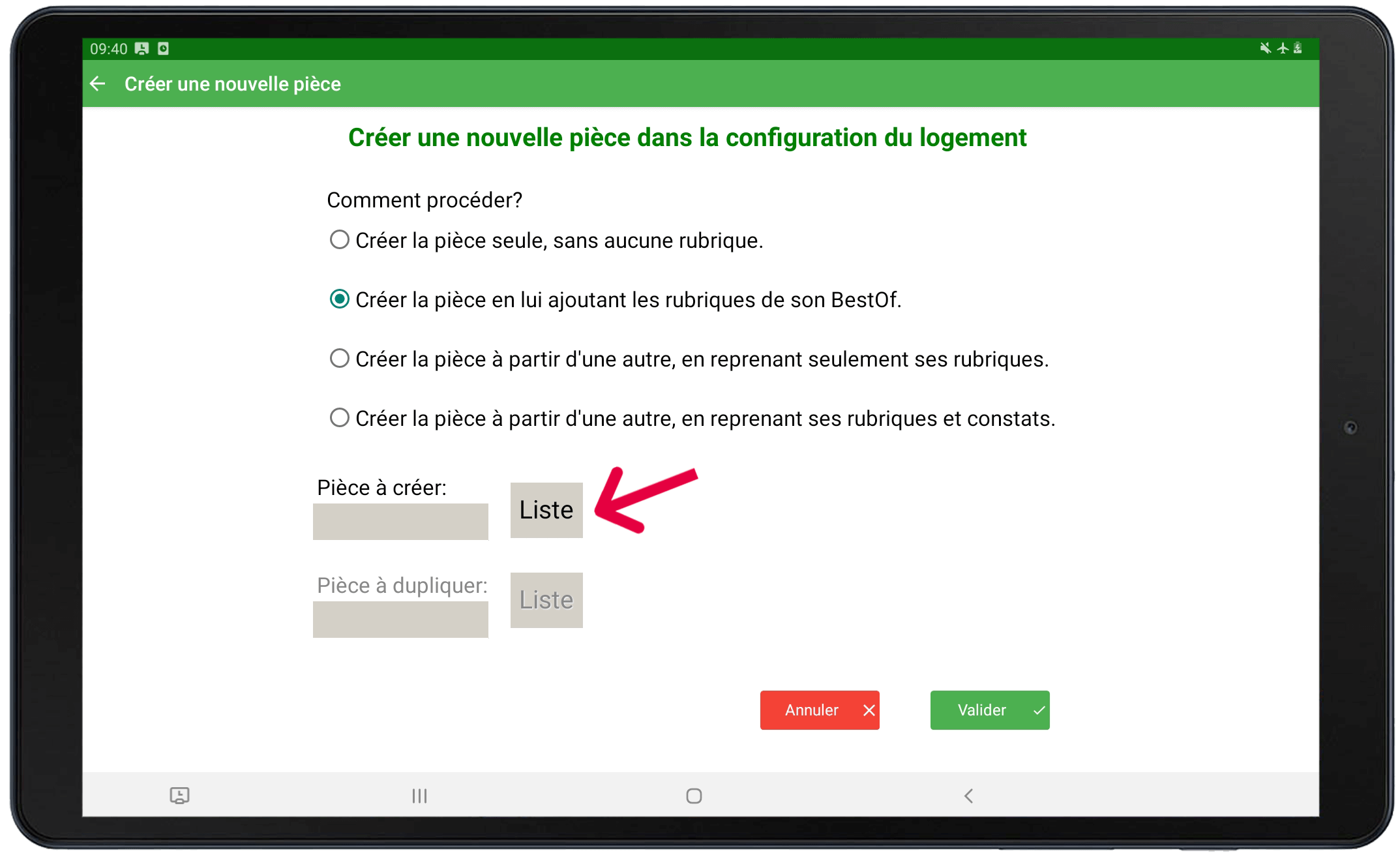 Sélectionnez la pièce à créer en cliquant sur le bouton Liste.