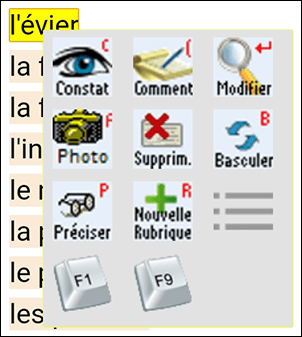 Pour insérer un constat sur une rubrique, il vous suffit de cliquer sur la rubrique pour la sélectionner : elle s'affiche sur fond jaune et le menu apparaît automatiquement.