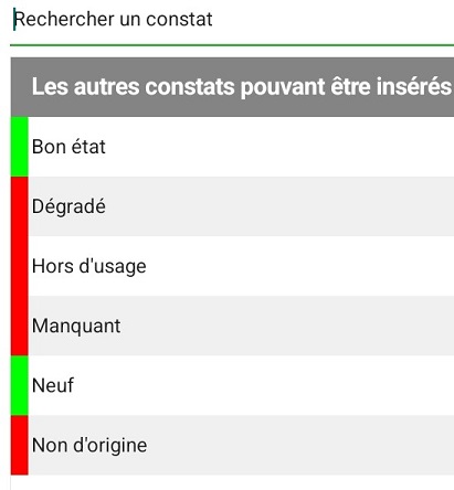 Dans cette liste de constats, certaines lignes commencent par un ruban coloré : en rouge ou en vert.