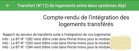 ABYL affiche le(s) numéro(s) de(s) BT créé(s) à la fin du transfert du logement sur le serveur.
