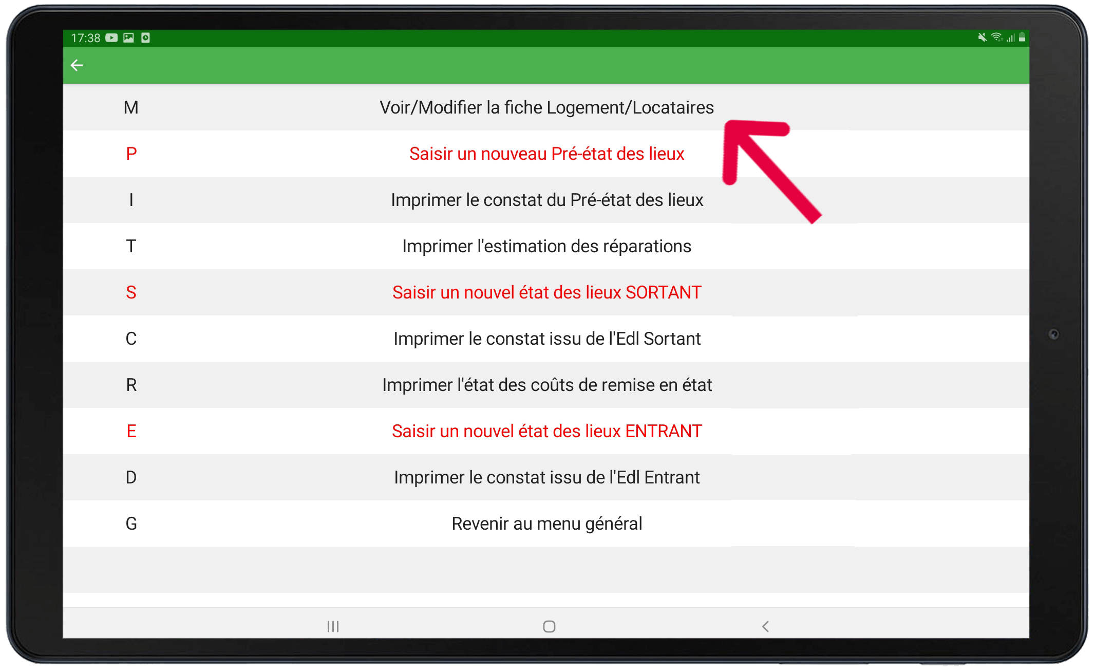 Ensuite vous pouvez revenir au menu et commencer votre état des lieux entrant.