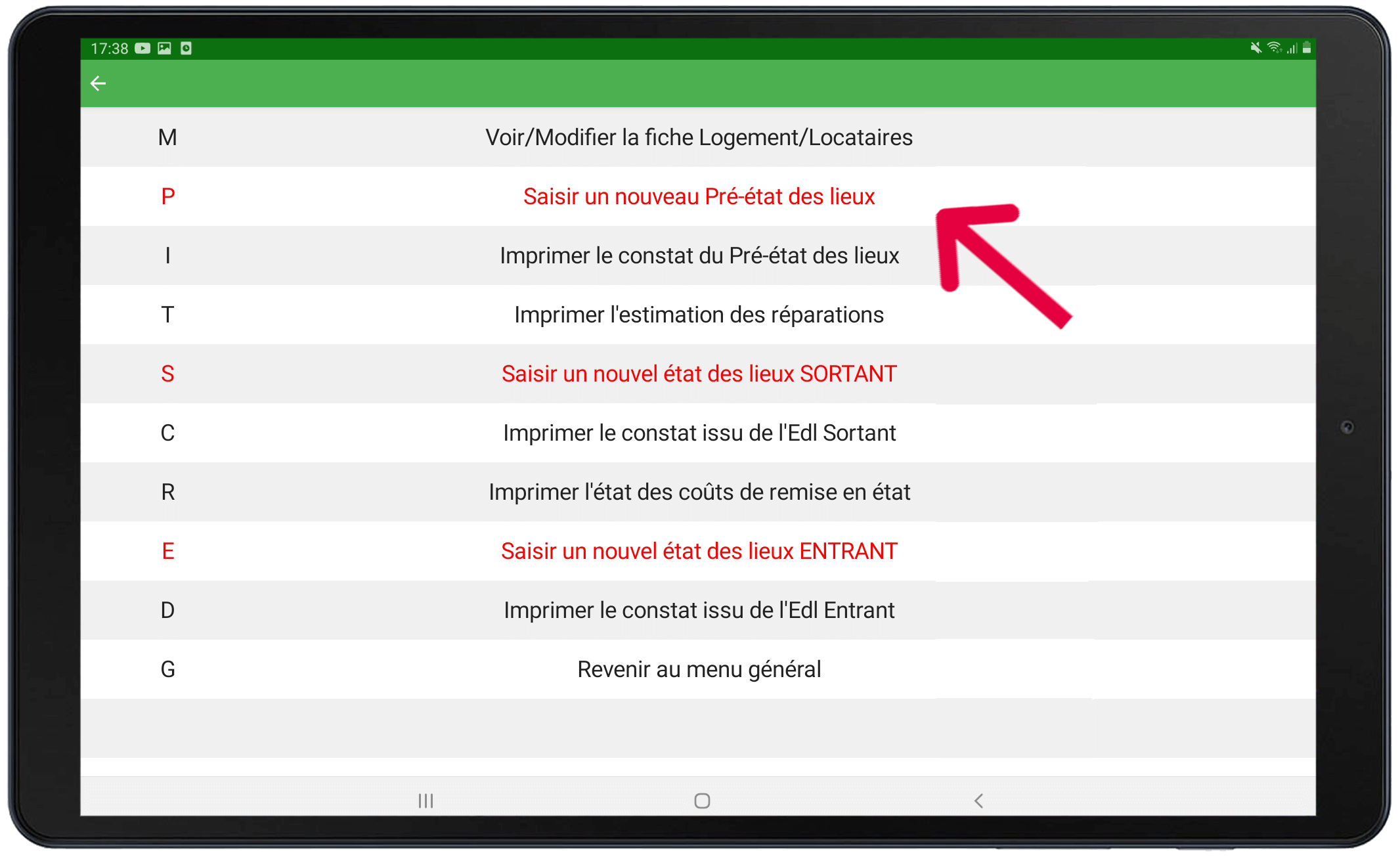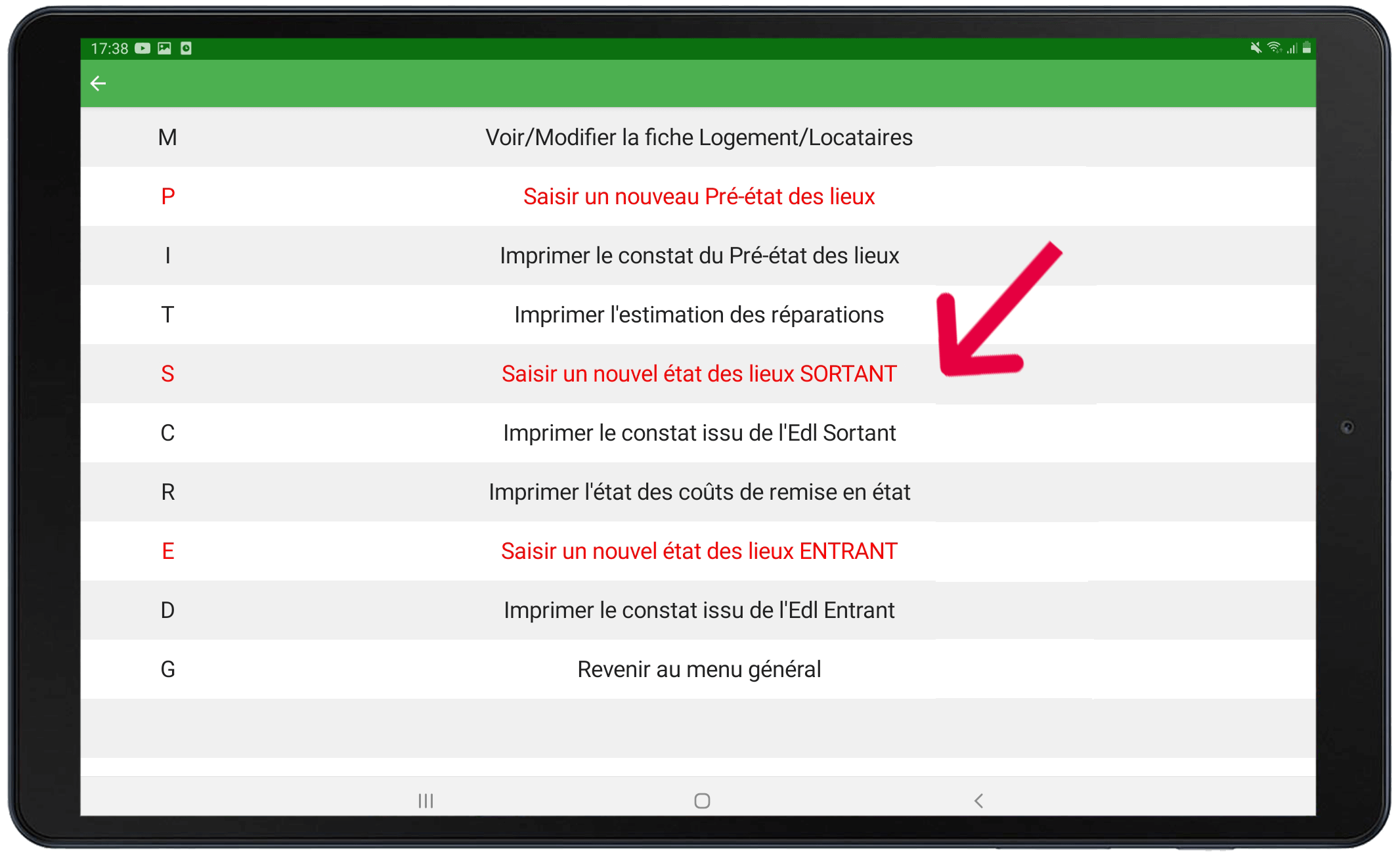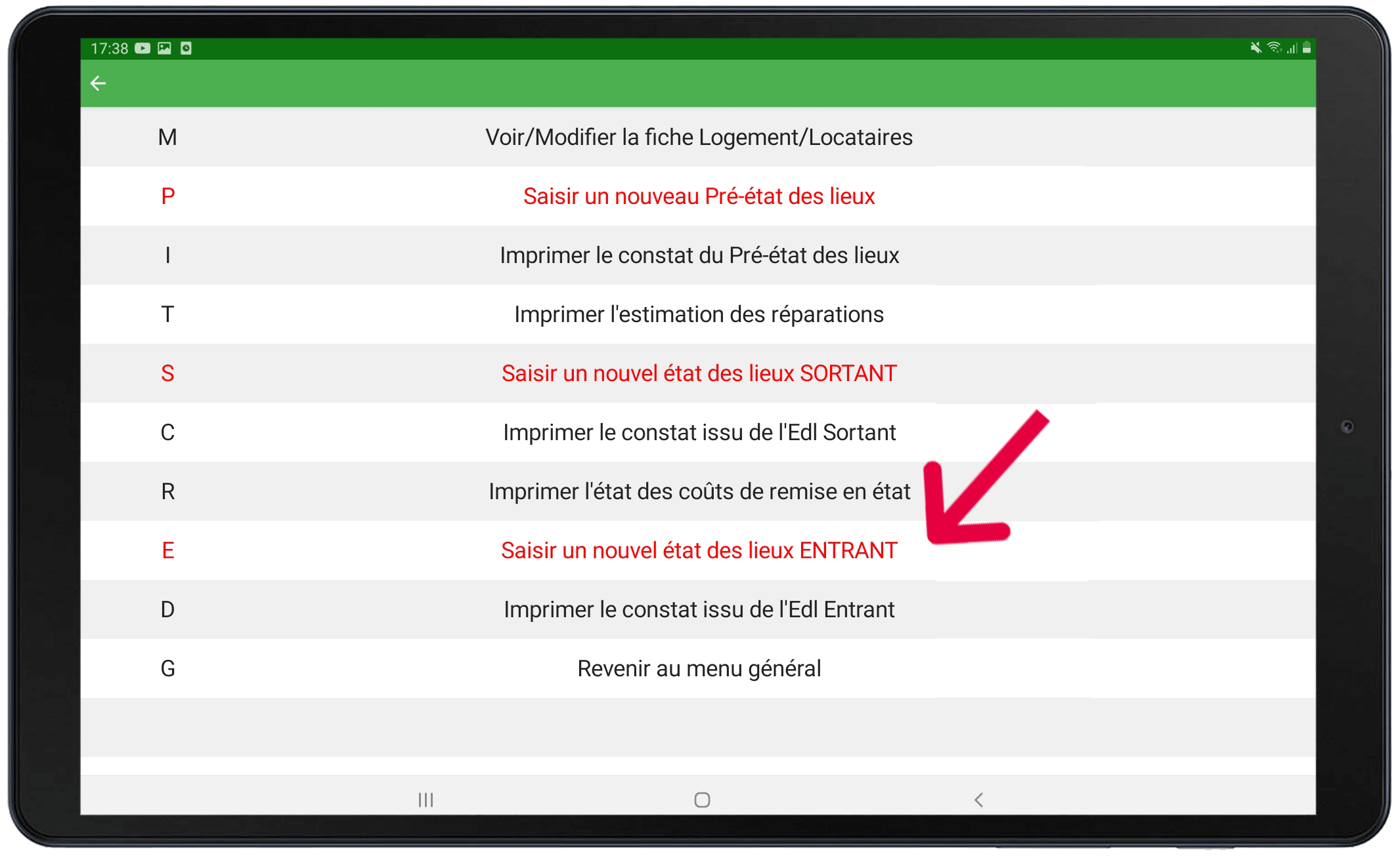 Parmi celles-ci vous pouvez choisir la saisie d'un état des lieux entrant :